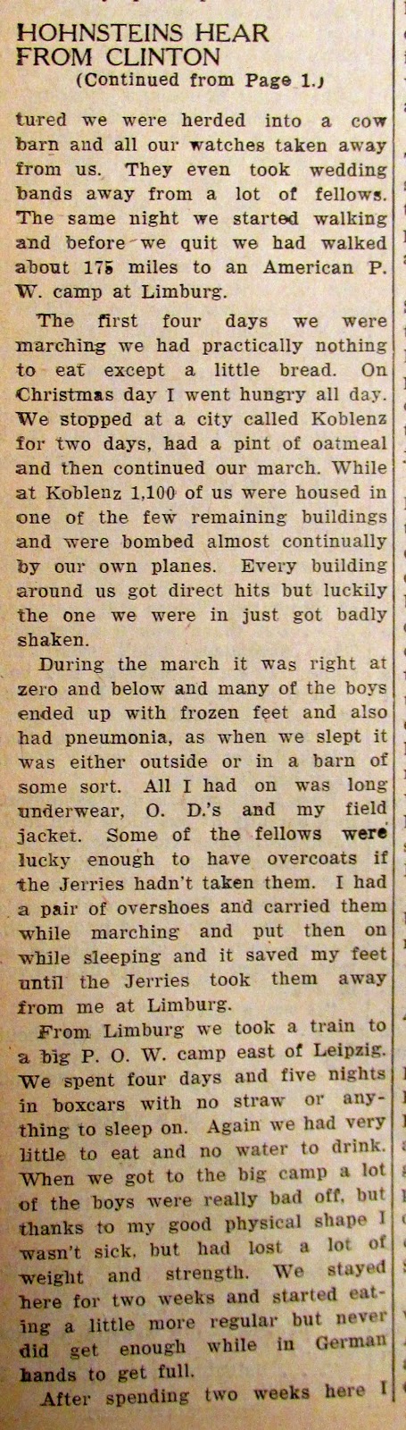 Pfc. Clinton Hohnstein wrote this letter to his Harvard parents immediately after being liberated from a German prisoner of war camp. The letter appeared in The Harvard Courier on May 31, 1945.