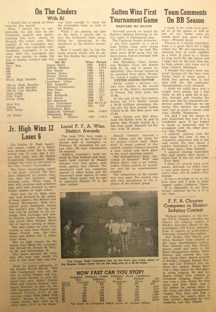 Miss Stella Softly was the faculty advisor. The 1954-1955 Mustang staff was Carl Schneller; Jerry Pearson, editor; Alvin Misener; Tom Schwab, co-editor; Marlys French; Kay Mankamyer; Marcia Savage; and Kay Figi.
