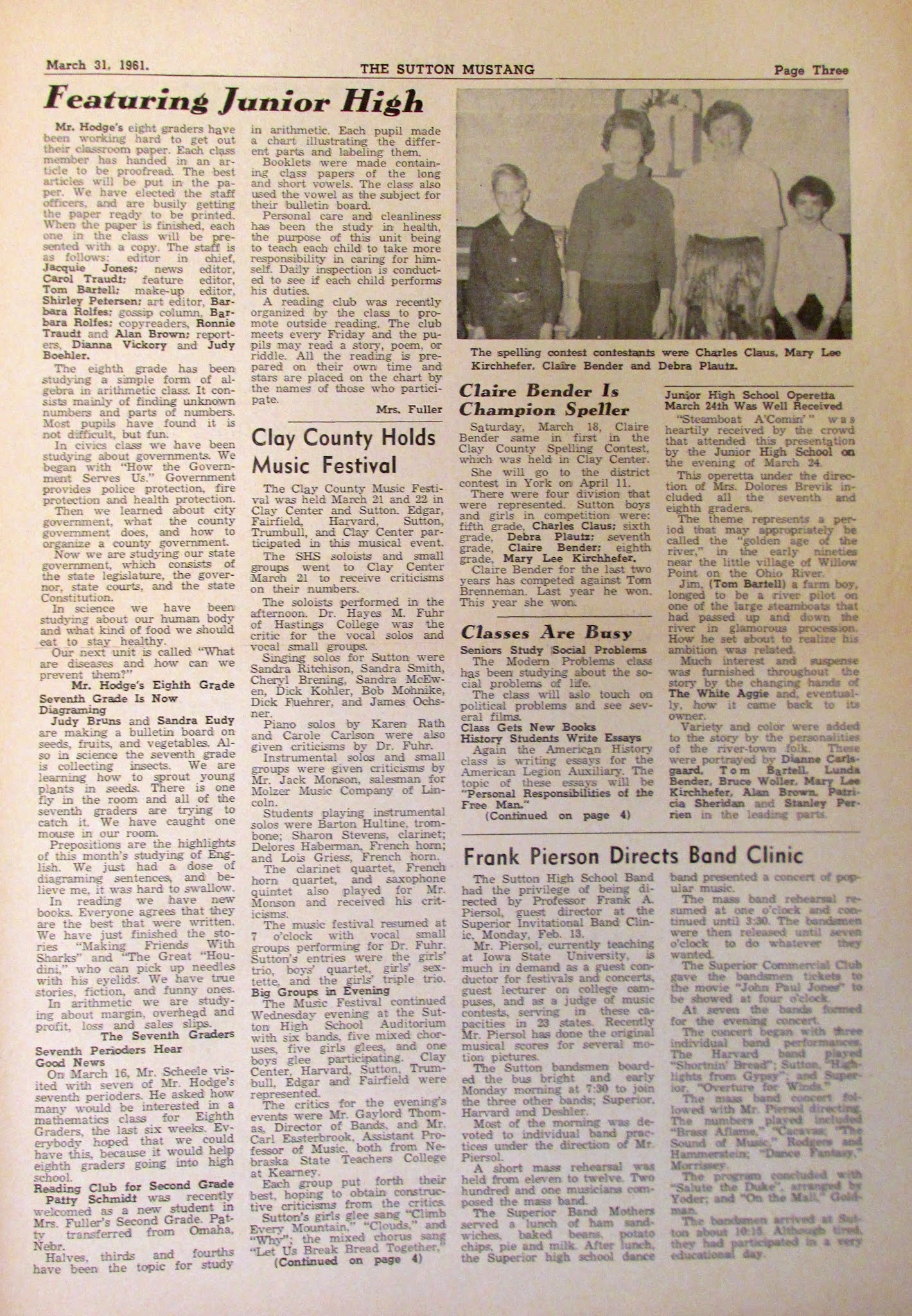 Miss Stella Softly was the faculty advisor for the newspaper. The 1960-61 staff was Paul Woller editor, Marcia Miller, Jerrell Johnson, Dee Schaad, Karen Eberhard, Mary Ann Krause, Paula Schneider, Jeanene Carlson, Sharon Stevens, Wanda Hornbacher, Richard Fuehrer, Zona Salmen, and Charlotte Campbell.